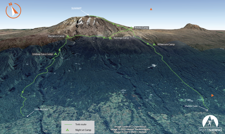 Trek through lush rainforest, moorland, alpine desert, and glacier zones, and finish your climb with a descent via Mweka Gate. This route is ideal for trekkers who want a serious challenge, a less traveled path, and the thrill of two summits in one trip.