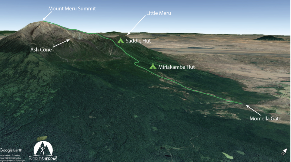 Steep ascent along the ridge with views of Meru Crater. Optional acclimatization hike to Little Meru (3,820 m). Early dinner and rest. (3–5 hrs)